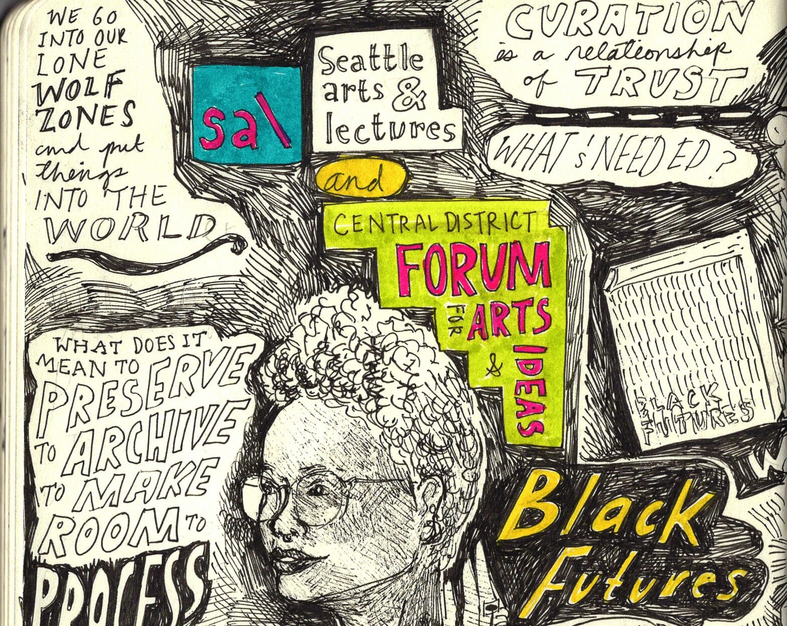 On December 2, Tessa watched co-editors Kimberly Drew and Jenna Wortham’s online-SAL Presents conversation with contributor King James Britt, celebrating the release of their Black Futures anthology, which SAL co-presented with CD Forum. Tessa drew as she watched, making this ultra-cool illustration!